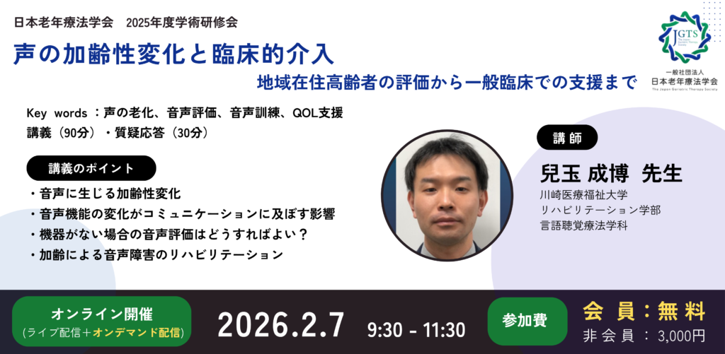 本企画を通じて、音声の加齢性変化に対する科学的理解を深めるとともに、あらゆる領域で高齢者支援に携わるリハビリテーション専門職に対し、音声機能支援の重要性と臨床応用の可能性についての認識を高めることを目的とする。